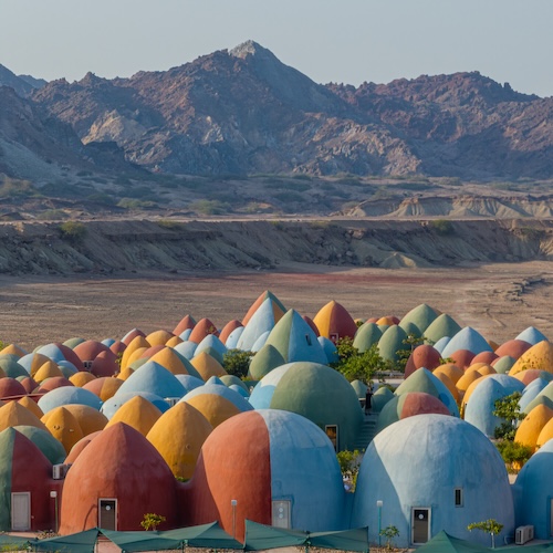 The Majara Residence and Community Redevelopment project on Hormuz Island in the Strait of Hormuz is made up of a series of dome structures painted in the ochre-rich colors of the island’s soil which offer eco-friendly lodging. Hormuz Island is known for its multicolored mountains. In the past its population was fewer than 6,000 people mainly living on fishing and illegal goods trafficking and offered limited tourism with only day-trippers or backpackers staying overnight.