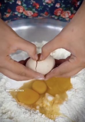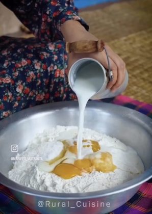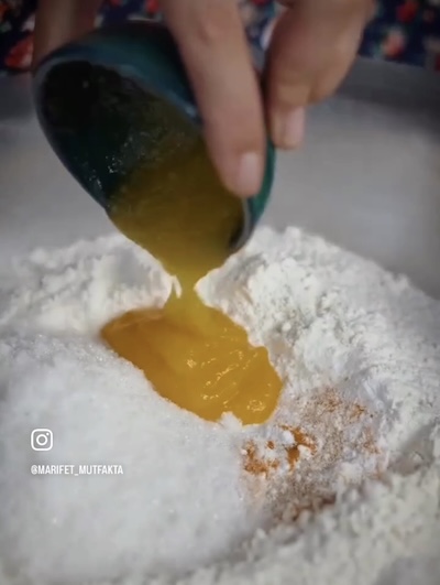 3. Add wet ingredients: Beat the eggs and add them to the flour mixture along with the semi-solid oil and activated yeast.