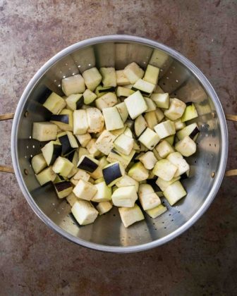 1. Peel the aubergines in alternating stripes, then cut them into 2cm-cubes and transfer to a large bowl. Sprinkle with 1 tablespoon (14g) of the salt and toss well with your hands to distribute the salt evenly. Tip them into a colander and place it on top of the used bowl to catch any juices. Set aside. To roast the aubergines in the oven, see Notes. If you’re cooking rice tahdig-style, you can start it now.