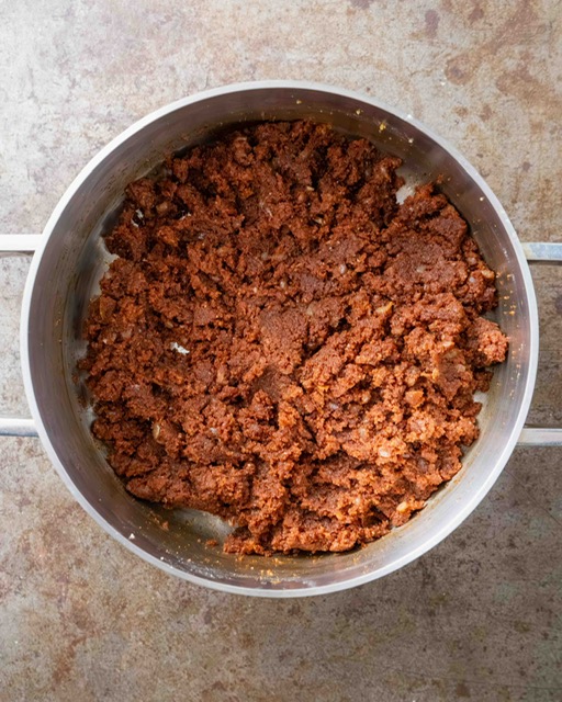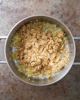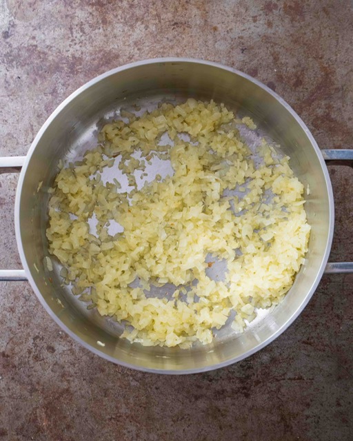 2. Heat 2 tablespoons of the olive oil in a large casserole over medium-low heat. Peel and finely chop the onion and sauté it in the oil until it turns translucent (8-10 minutes). Meanwhile, add the walnuts to a food processor (I like doing it in two batches in a small food processor) and blend until they turn into a coarse paste. They’re ground fine enough when some of them start breaking down into a walnut butter along the sides of the food processor.