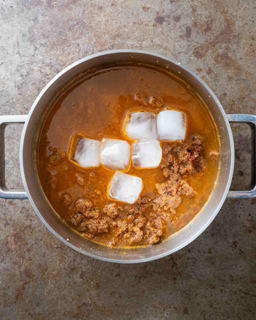 3. Add the ground walnuts to the onions and sauté for 1-2 minutes until they smell aromatic. Tip in the cinnamon, pepper and turmeric and cook for a minute to heat them through. Add the tomato paste, pomegranate molasses and the remaining tablespoon of salt (14g), stir well and cook for another minute, then pour in 500ml of cold water along with the ice cubes. Bring to a boil, reduce the heat and simmer covered for 30 minutes until the stew has thickened and the oil from the walnuts floats on the surface.