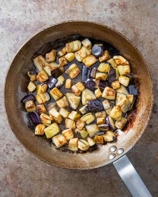 4. Meanwhile, heat another 2 tablespoons of the oil in a large non-stick frying pan over medium heat. Squeeze the aubergine pieces between your hands to remove more of the residue liquid, then fry them in two batches until golden (10-15 minutes per batch), stirring every now and then and adding more oil if needed. Transfer the cooked aubergine pieces to a plate before continuing with the rest.