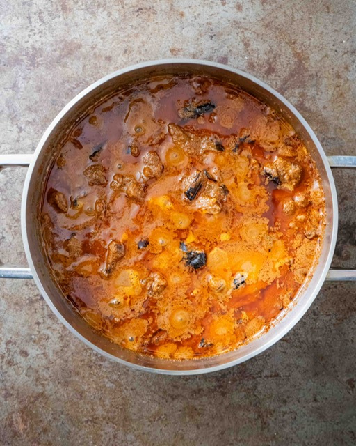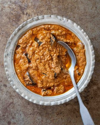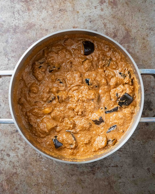 5. Add the aubergine pieces to the stew and gently stir them in, then cook covered for 10 minutes more. By now, you should see rapid bubbles cutting through the oil and blipping on the surface, a sign that it’s ready. Divide the stew over bowls and serve alongside freshly steamed rice.