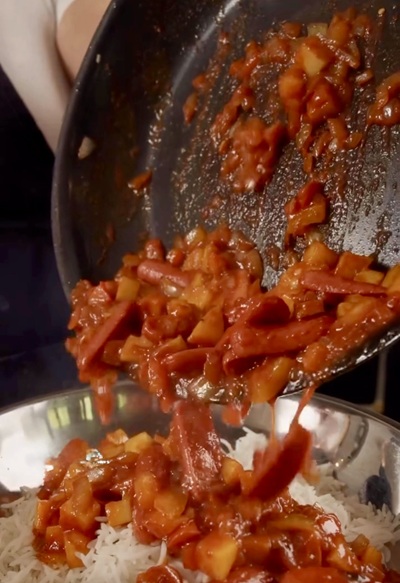 • Spoon the sosis bandari mixture evenly over the rice.